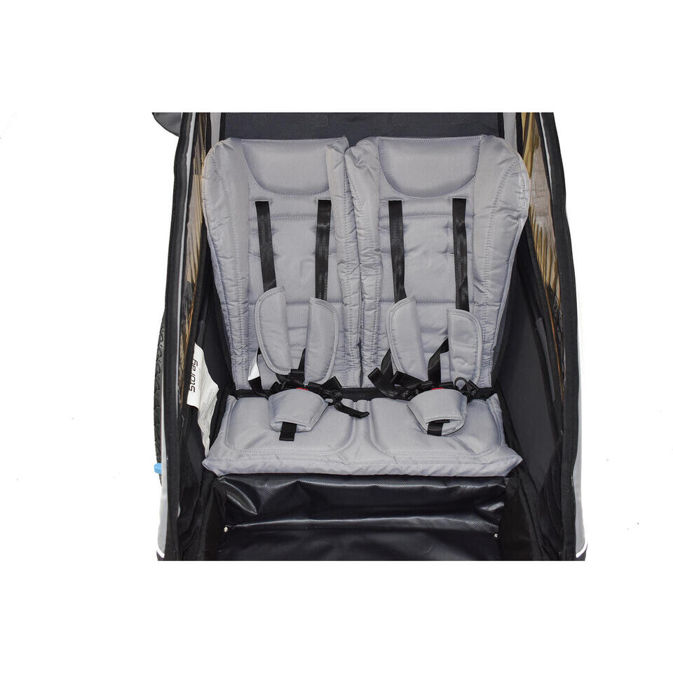 Este reboque de bicicleta para duas crianças é ideal para os seus passeios. Grande compartimento de armazenamento na parte de trás. Este reboque pode ser dobrado para poupar espaço quando não estiver a ser utilizado. Reflectores em cada roda e na traseira e uma bandeira de segurança estão também incluídos para o ajudar a manter-se visível. Os seus bancos e cintos de segurança elevados garantir-lhe-ão um bom assento. O seu sistema de suspensão permitirá passeios confortáveis em todos os tipos de estradas. Travão de estacionamento. Está também incluído um kit de rodas dianteiras para o converter num carrinho de mão. Dimensões internas (comprimento x largura x altura): 74x52x92cm. Dimensões exteriores com rodas (comprimento x largura x altura): 164x80x94cm. Dimensão dobrada sem rodas (comprimento x largura x altura): 96x57x28cm CARGA MÁX: 40Kg. Sistema de fixação directamente sobre o eixo da roda traseira da bicicleta.