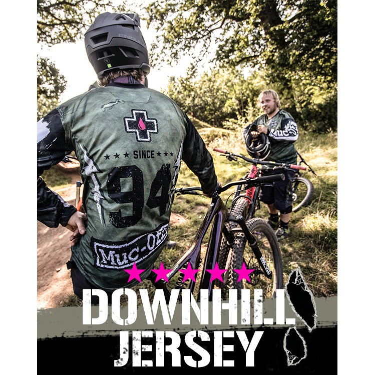 Muc-Off: "This punk-inspired Muc-Off DH Jersey was designed using a scanned copy of a khaki green Army surplus jacket... Features: 100% polyester, Moisture wicking & breathable, Elasticated cuff /neck..."