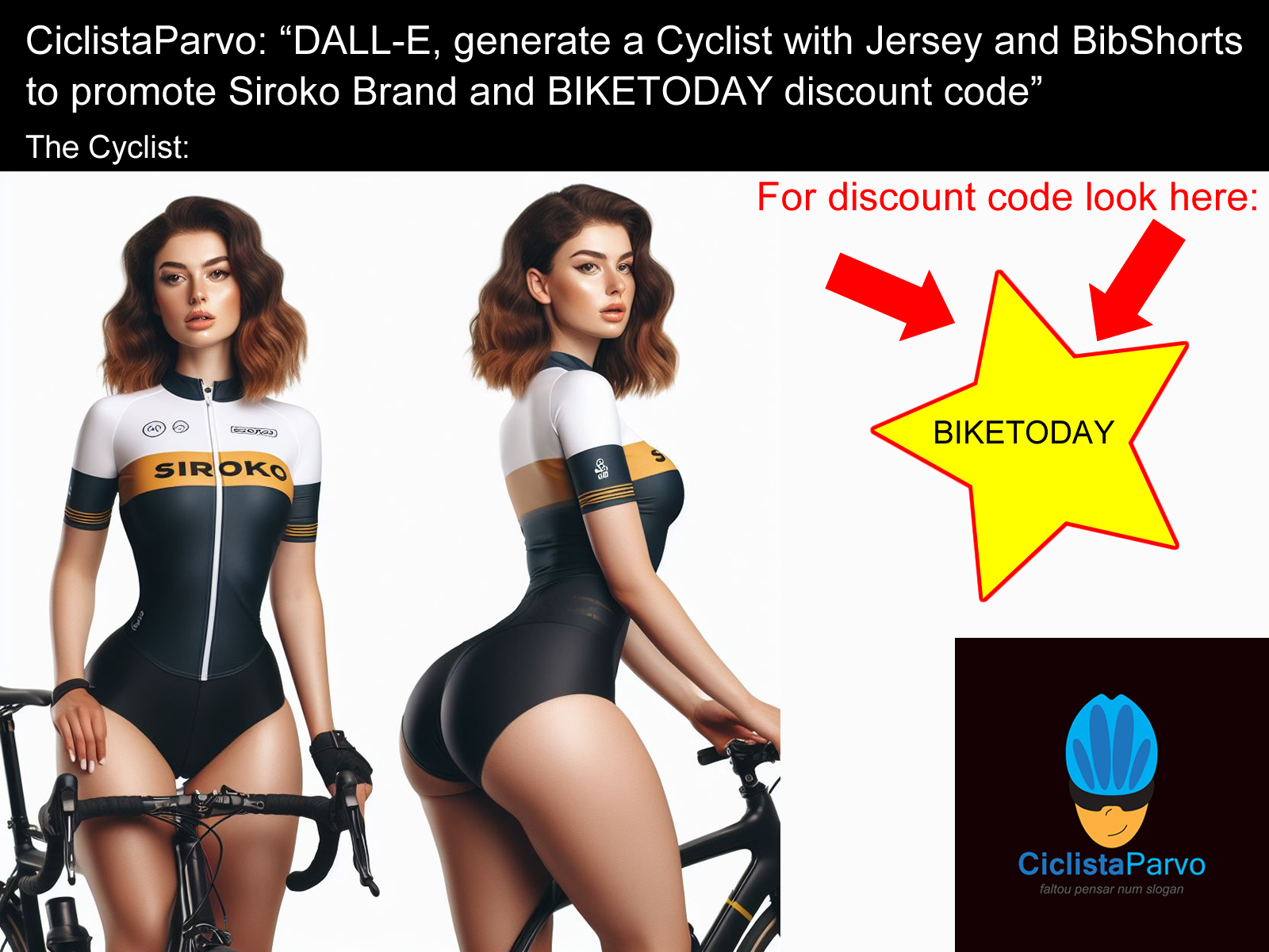 CiclistaParvo: “DALL-E, generate a Cyclist with Jersey and BibShorts to promote Siroko Brand and BIKETODAY discount code”